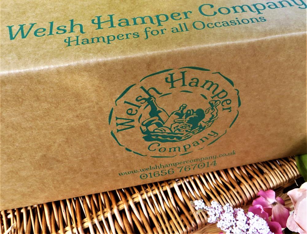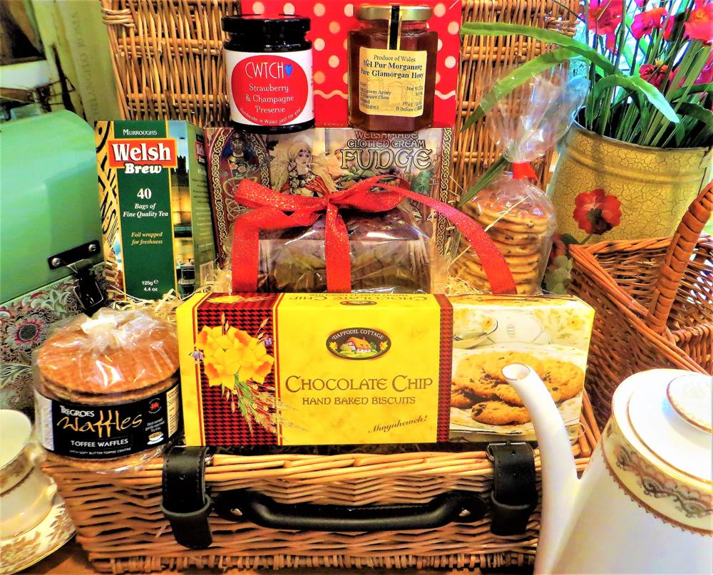 Wicker basket with Wonderful Welsh food, includes - Pure Welsh honey " just the bees knees", fruit cake, Welsh Brew, Handmade Welsh preserve, Welsh Fudge, Welsh cakes, Welsh biscuits, Welsh Waffles.